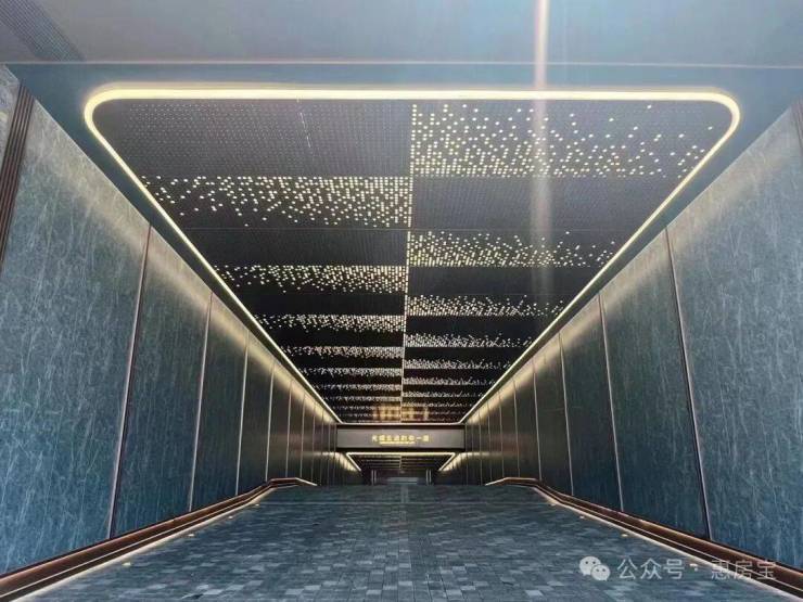 星空连廊的顶面采用香槟金铝板、墙面为爱马仕灰仿石砖,并镶嵌金属线条、就连地面都采用了夜里雪仿石砖